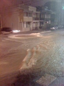 ater to go down and so began to pour over the pavement and across the road. As there were streets above us up the hill, it all funnelled down this one road and the road became a river. Before long, all the manholes in the road were hovering over gushing water coming from the sewers, including the sewerage pipes… and the river was all kinds of colours. Then waves started occuring and little rivers were going off to the sides into people’s houses. A cab drove through and got stuck in a hole that used to have a manhole cover