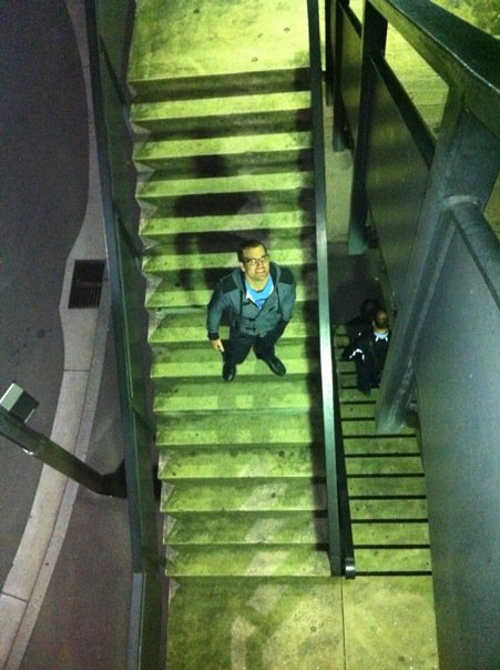It sure is warming up now. And the sky is bluer and the trees are greener and the cat next door sleeps on the couch out the front of their house, instead of in a car exhaust pipe. (made that last bit up) Thats me on stairs looking up, by the way.