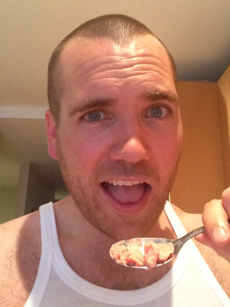 So I was flicking through my gym’s free magazine (notice the word free, which is the reason why I took it) and it listed a recipe for “Healthy Strawberry Ice Cream”. I was suspect from the beginning but decided to watch myself play the incident out and see how I went making it. I bought a tonne of strawberries, blended them up with the other ingredients (including strawberry jelly?) then placed it in the freezer. I opened up the container the next day and saw it all pink and cold, ready for me to enjoy:
