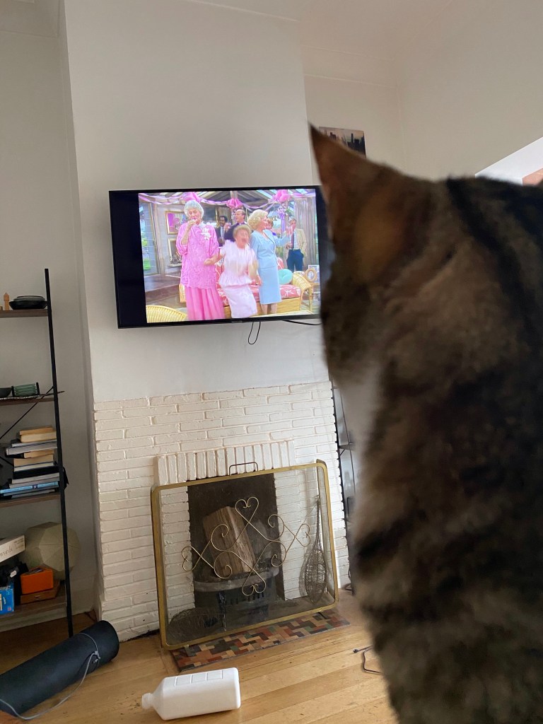 An hour goes by, coffee gone and I feed the cat. I move my coffee table out of the way, unroll my gym mat and turn the fitness app on that streams to my TV. Thirty minutes later I am sweating and sore, I have a shower then heat up my breakfast. Usually an egg and vegetable bake that I made on Sunday for the week. After eating, I am on couch for another few hours. I play a colored jewel game on my iPad. The Golden Girls is a show I have only just begun watching, its on in the background giving comfort that the late 1980s seems to give people.
