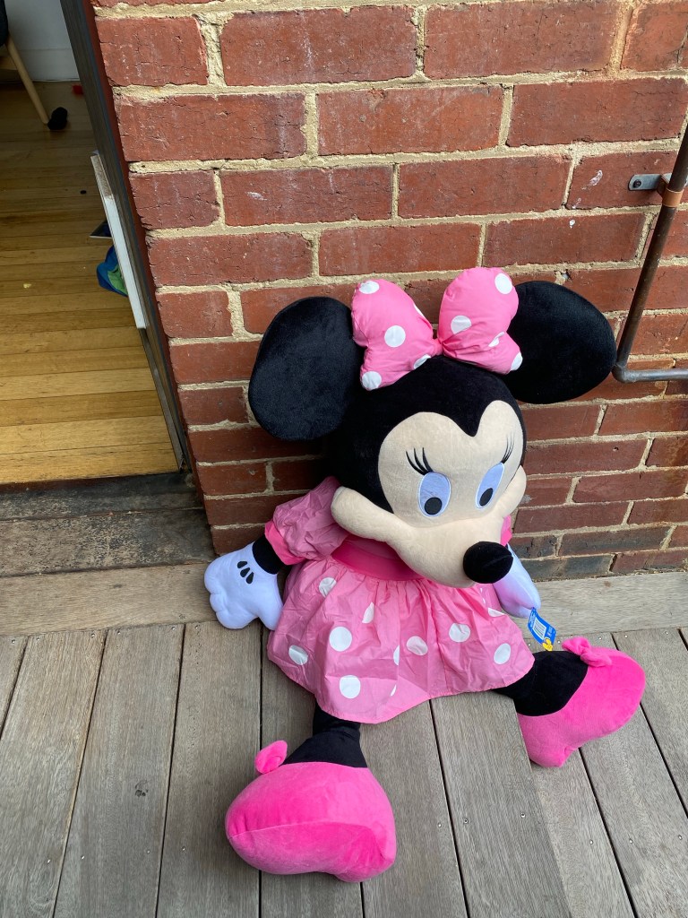 I took a photo and posted it on the local residents page. Maybe someone put it at my house by mistake? Maybe it was a drug drop off but they confused the address? Was Minnie full of cash? Or drugs? I picked her up, mindful that my yard faces onto a bunch of units, some probably seeing their grown neighbour holding up a large Disney toy in his yard, with no children on a weekday morning. Maybe I will wait for darkness, to inspect further. Do I stab her, cut her open and see if there is a secret message? Am I overthinking this? You are overthinking this.